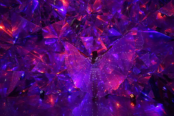 With its impressive structure and changing lights, The Dome is an immersive space giving people the opportunity to step into a psychedelic new dimension. The huge installation - Kaz’s biggest dome to date - is made of geometric panels and has multiple facets, reflecting light and changing colours like a giant 3D kaleidoscope. Festival goers could step inside the structure to fully experience the magic of Kaz’s creation, seeing their reflections in the multifaceted mirror from different angles.