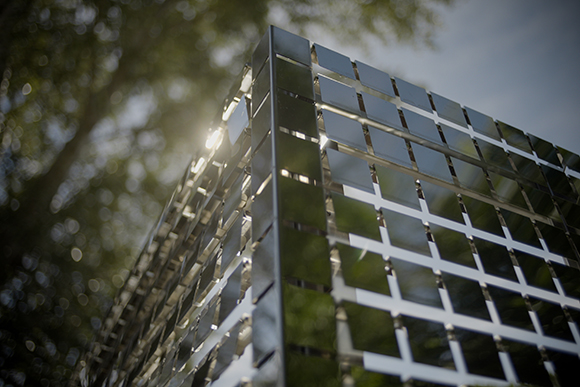 “This artwork is a light sculpture based on a collaboration between invisible forces », explains the artist. The installation enables a multi-sensorial interaction with its surrounding environment as an ever-evolving piece. Thin mirror plates sway in the wind and produce a soft, music-like sound, while the reflection of the sun rays and the surrounding landscape creates distortions, light and shadow around the metallic cube. « It is as if the light is dancing », suggests Shirane.